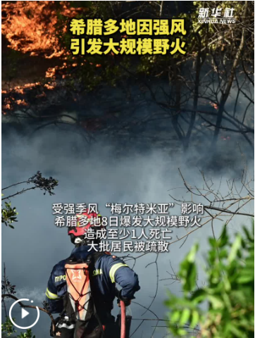 受强季风“梅尔特米亚”影响,希腊多地8日爆发大规模野火,造成至少1人死亡,大批居民被疏散。