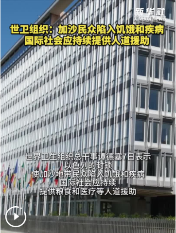 世界卫生组织总干事谭德塞7日表示,以色列的封锁使加沙地带民众陷入饥饿和疾病,国际社会应持续提供粮食和医疗等人道援助。