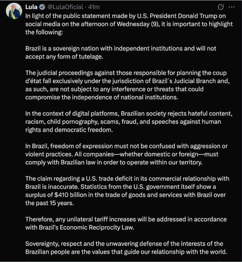 [新闻] 巴西总统卢拉:将“对等回应”美加征关税措施巴西总统卢拉:将“对等回应”美加征关税措施