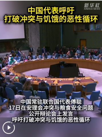 中国常驻联合国代表傅聪17日在安理会冲突与粮食安全问题公开辩论会上发言,呼吁打破冲突与饥饿的恶性循环。