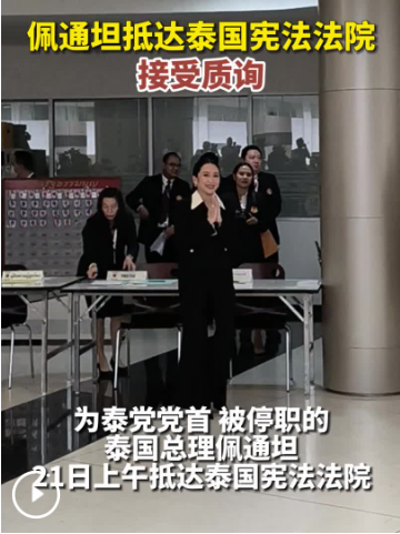 为泰党党首、被停职的泰国总理佩通坦·钦那瓦21日上午抵达泰国宪法法院,准备就其与柬埔寨参议院主席洪森通话录音事件接受质询。