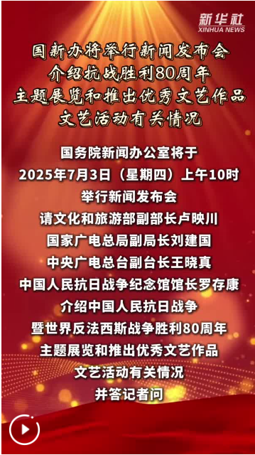 [新闻] 国新办将举行新闻发布会 介绍抗战胜利80周年主题展览和推出优秀文艺作品、文艺活动有关情况