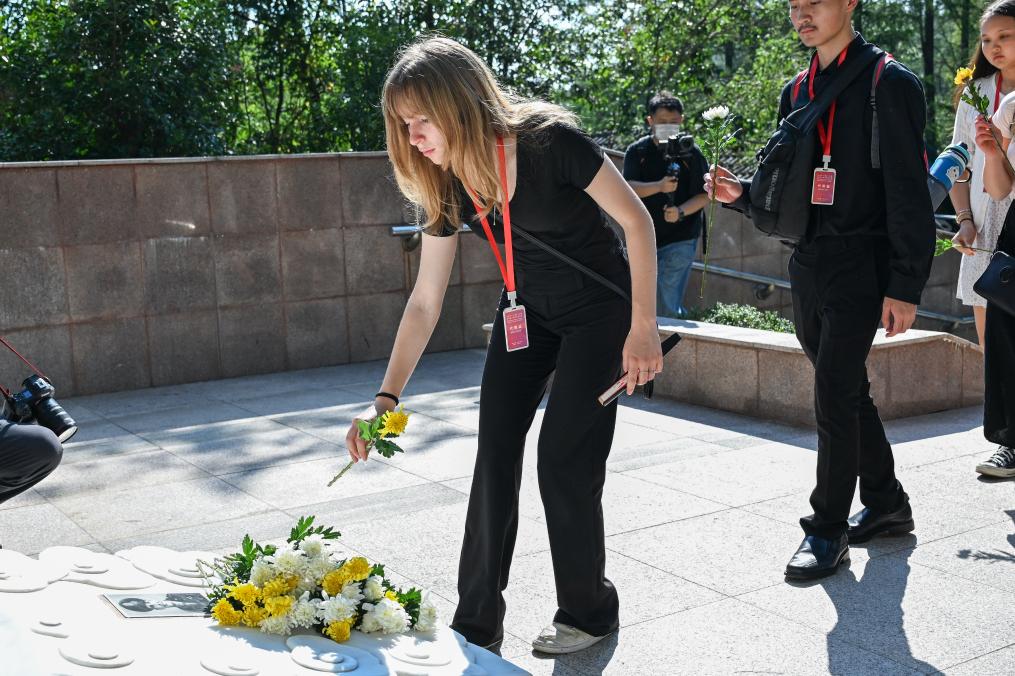 2025年7月28日,美中航空遗产基金会主席格林和飞虎队老兵后代及多所飞虎队友谊学校的师生访问湖北。图为美国学生排队在飞虎队队员格伦·本尼达墓碑前献花。新华社记者 杜子璇 摄