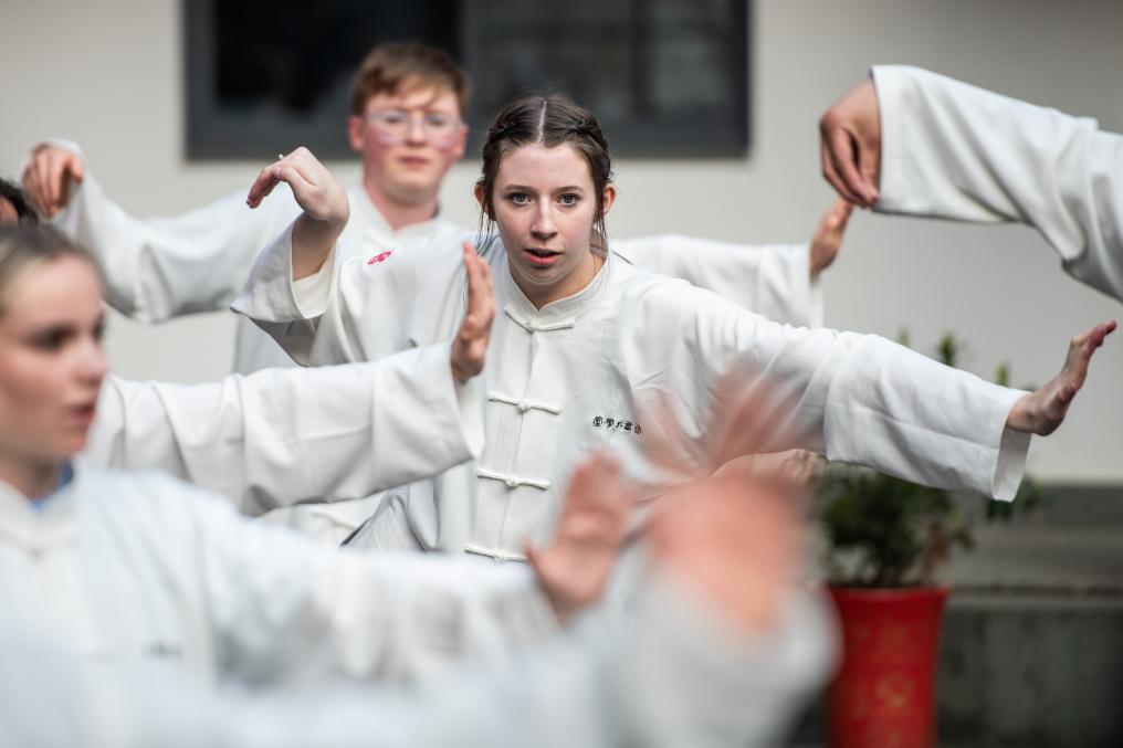 2024年3月22日,美国华盛顿州中学生代表团成员在武当山体验太极武术。新华社记者 伍志尊 摄